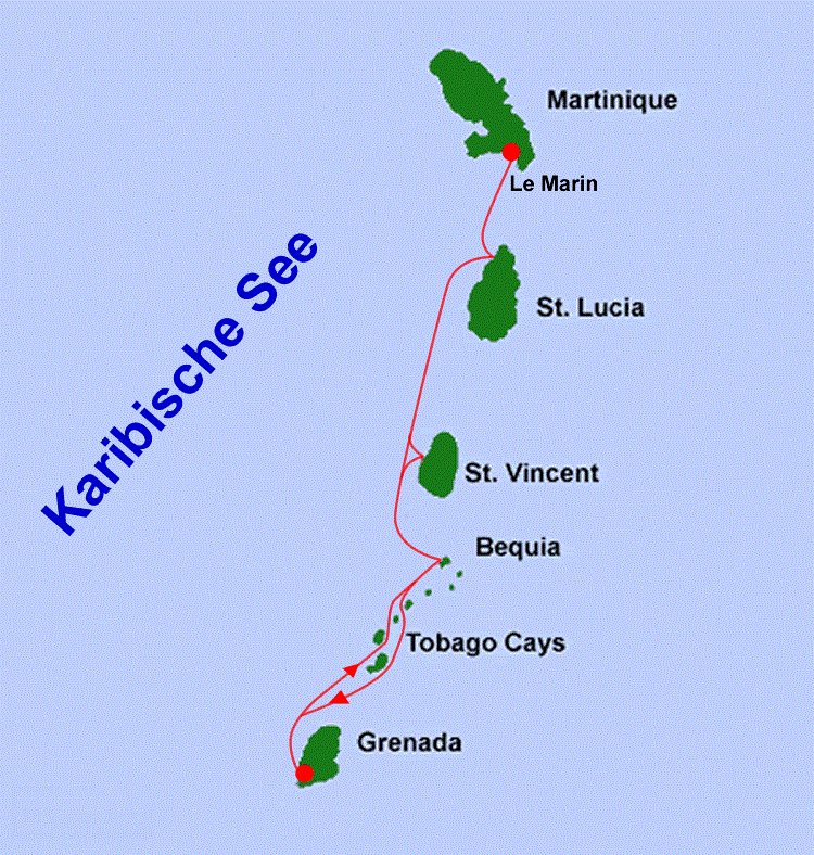 Am nächsten Morgen segeln wir dann früh los und nach Bequia, Port Elisabeth. Dort wird dann am nächsten Morgen für SVG einklariert. Von da aus dann in die südlichen Grenadinen, die berühmten Tobago Cays, Salt Whistle Bay auf Mayreau, Union Island (Clifton und Chattam Bay), Petit St. Vincent, Petit Martinique(gehört schon zu Grenada) und dann langsam wieder hoch, auf dem Rückweg noch einen Stop auf der Hauptinsel St.Vincent, z. B. Wallilabou,.Von dort nach Soufriere auf St. Lucia, LP unter den Eichen, den Pitons und dann über die Marigot Bay wieder zurück nach Le Marin.